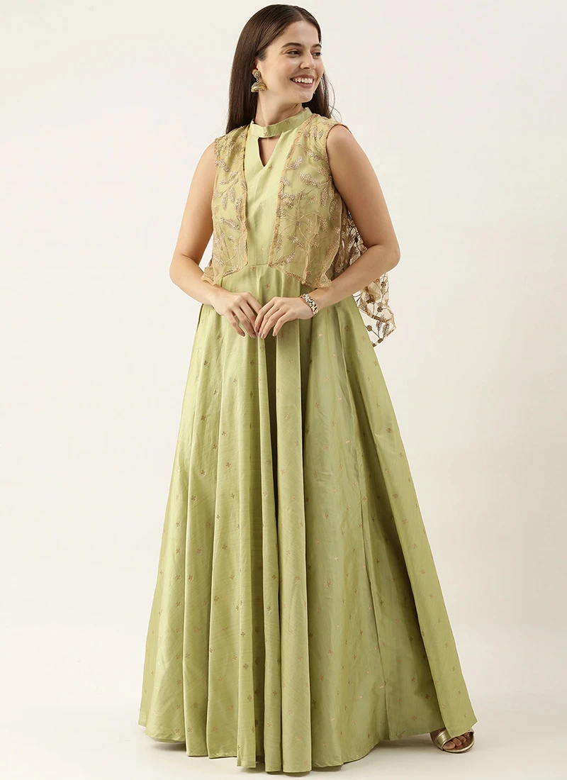 Ethnovog Pista Green Jacket Style Gown Party Wear