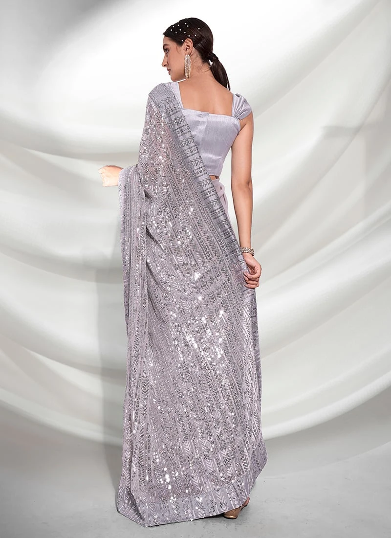 Georgette Grey Color Embroidery Sequins Saree Party Wear