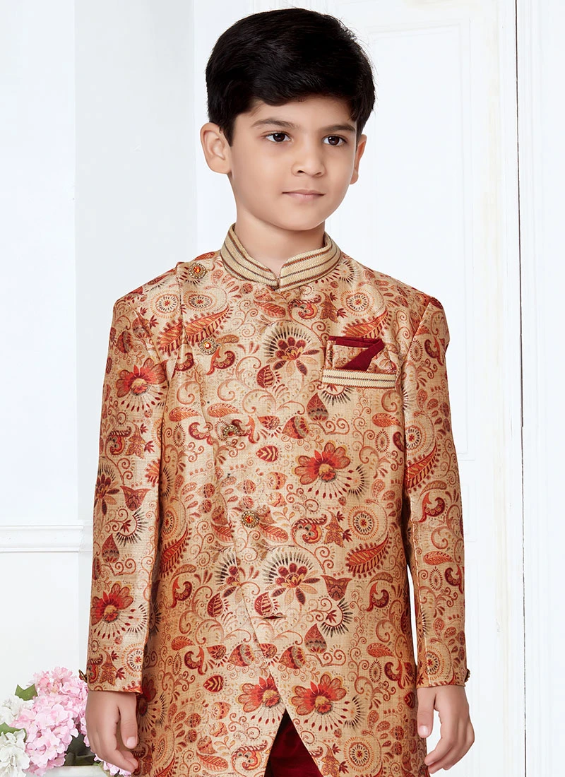 Gold N Maroon Jacquard Silk Printed Indowestern Sherwani Party Wear