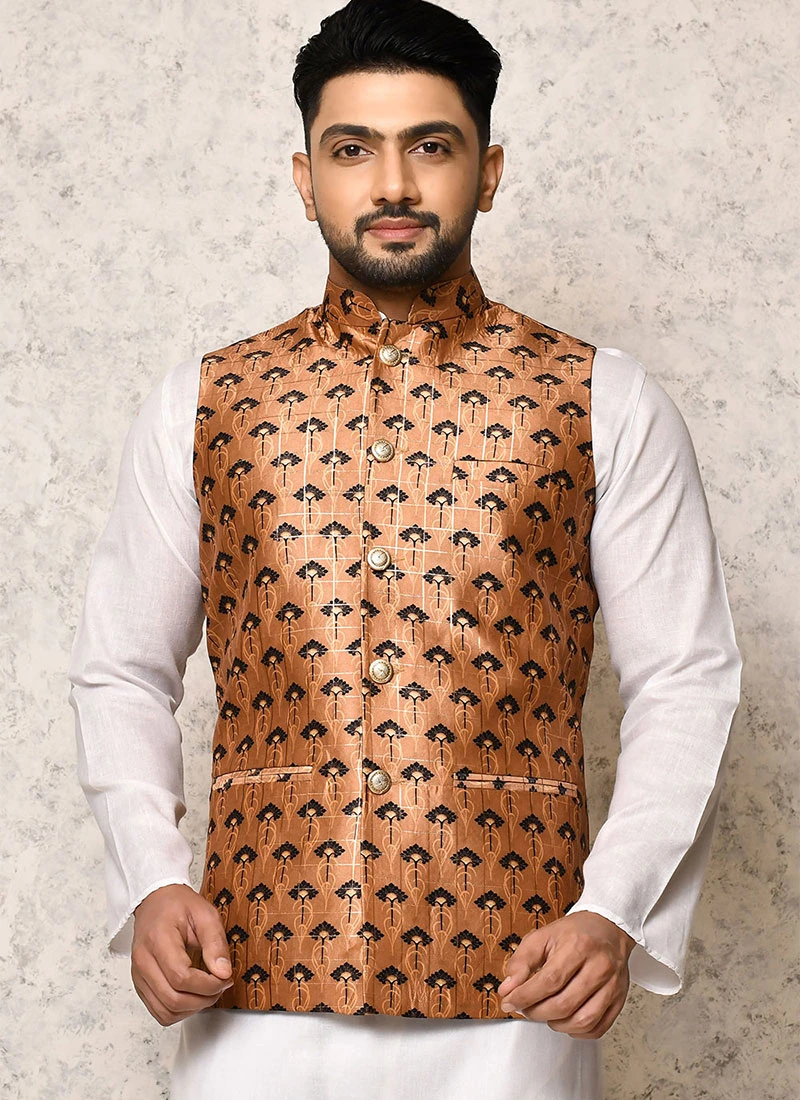 Your special days will trend up with this golden art silk nehru jacket crafted with mandarin collar neck and sleeveless enriched with printed work is representing royalty in itself.