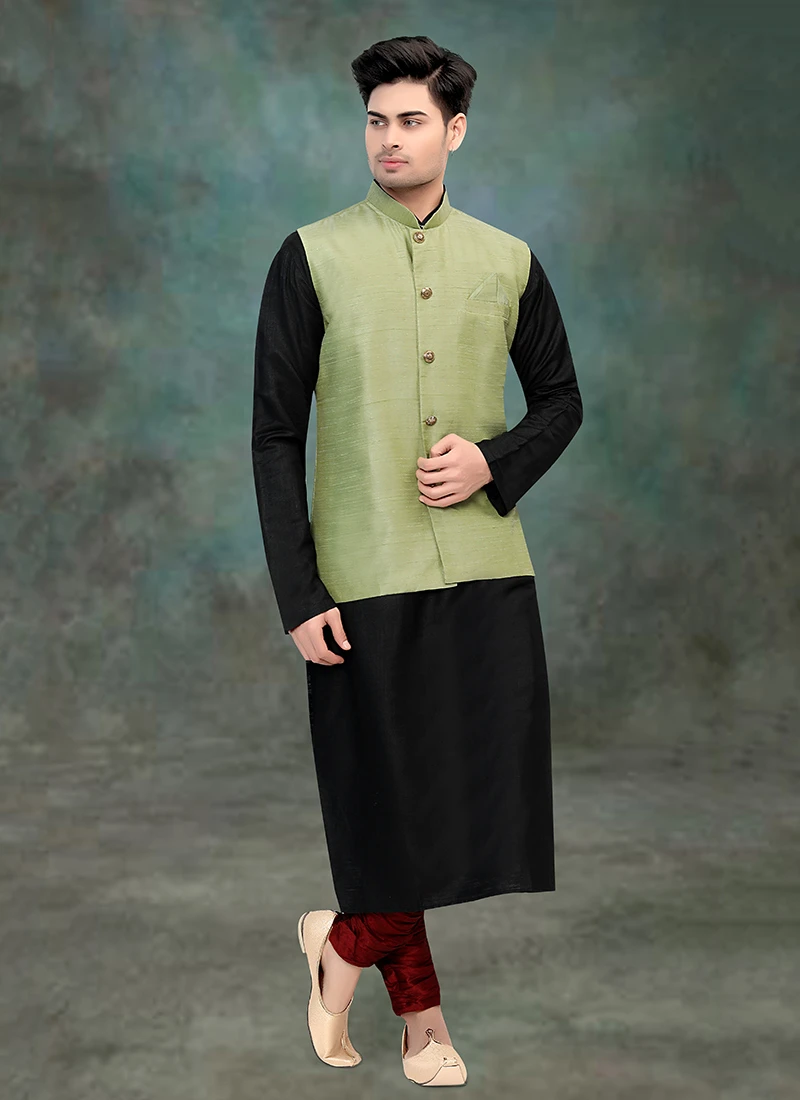Be your own style icon in this green art silk nehru jacket crafted with mandarin collar neck and sleeveless enriched with plain work is representing royalty in itself.