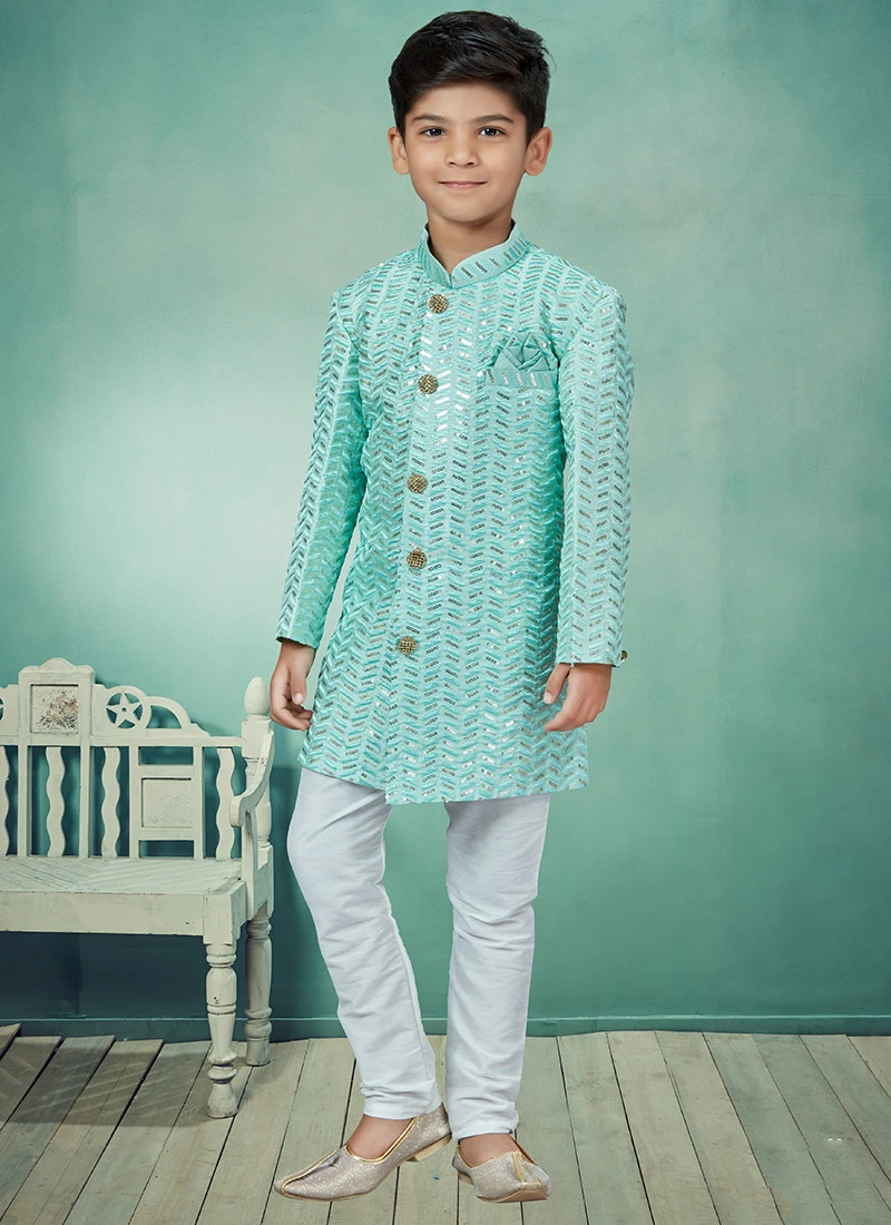 You will be confident to make a impressive fashion statement with this green art silk fabric indowestern sherwani with sequins work over the sherwani makes more attractive crafted with collar neck and full sleeves. This sherwani comes with off white silk dupion chudi pant bottom.dupion chudi pant bottom.