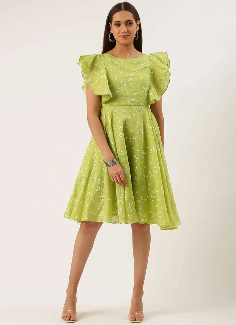 Green Blended Cotton Foil Printed Ruffled Dress After Six Wear