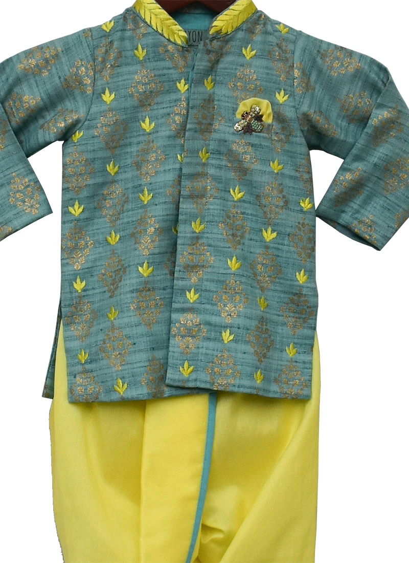 Fayon kids presents green blended cotton kurta dhoti set with embroidered and zari woven motifs on the kurta. Comes with matching dhoti bottom.