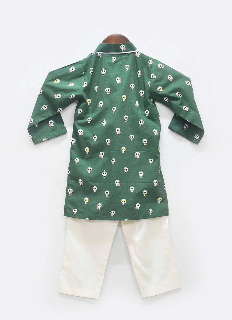 Be fascinating your boy in this stunning green cotton boys kurta pyjama will make you stylish and graceful. It printed work crafted with full sleeves and collar neckstyle looks chic and ideal for any affair. This set comes with off white cotton silk straight pant bottom.