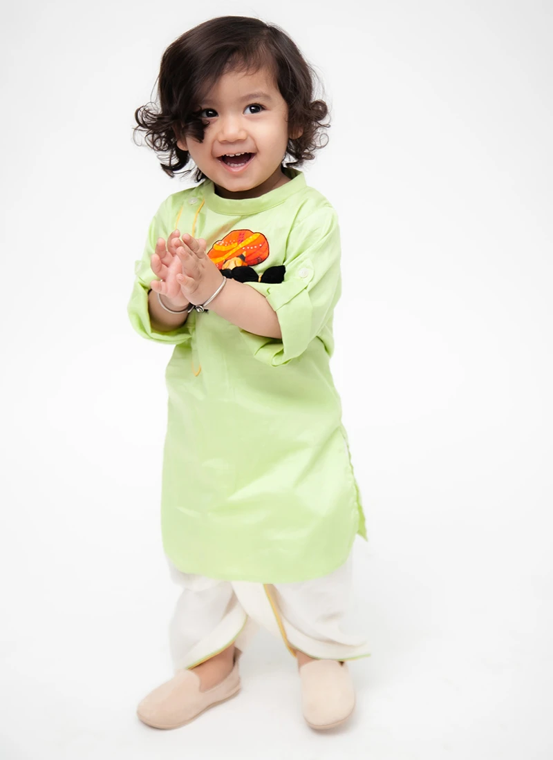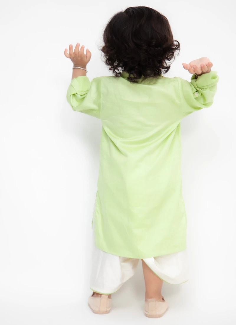 Style and trend will be at the peak in this green cotton silk kids boys kurta pyjama. It looks chic and ideal for any affair crafted with full sleeves and collar neckstyle . This set comes with off white cotton silk dhoti bottom.