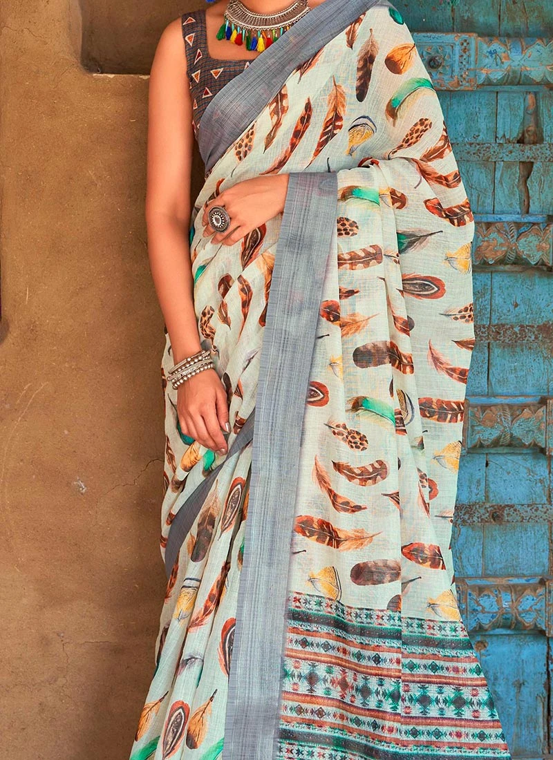 In summary the Green Linen Digital Print Saree is a masterpiece of craftsmanship and design. Its combination of vibrant colors intricate digital prints and comfortable fabric make it a musthave in every womans ethnic wear collection. Whether you are attending a special occasion or a casual gathering this saree is bound to make you stand out and leave a lasting impression. Embrace the timeless beauty of Indian tradition with this exquisite Green Linen Digital Print Saree.