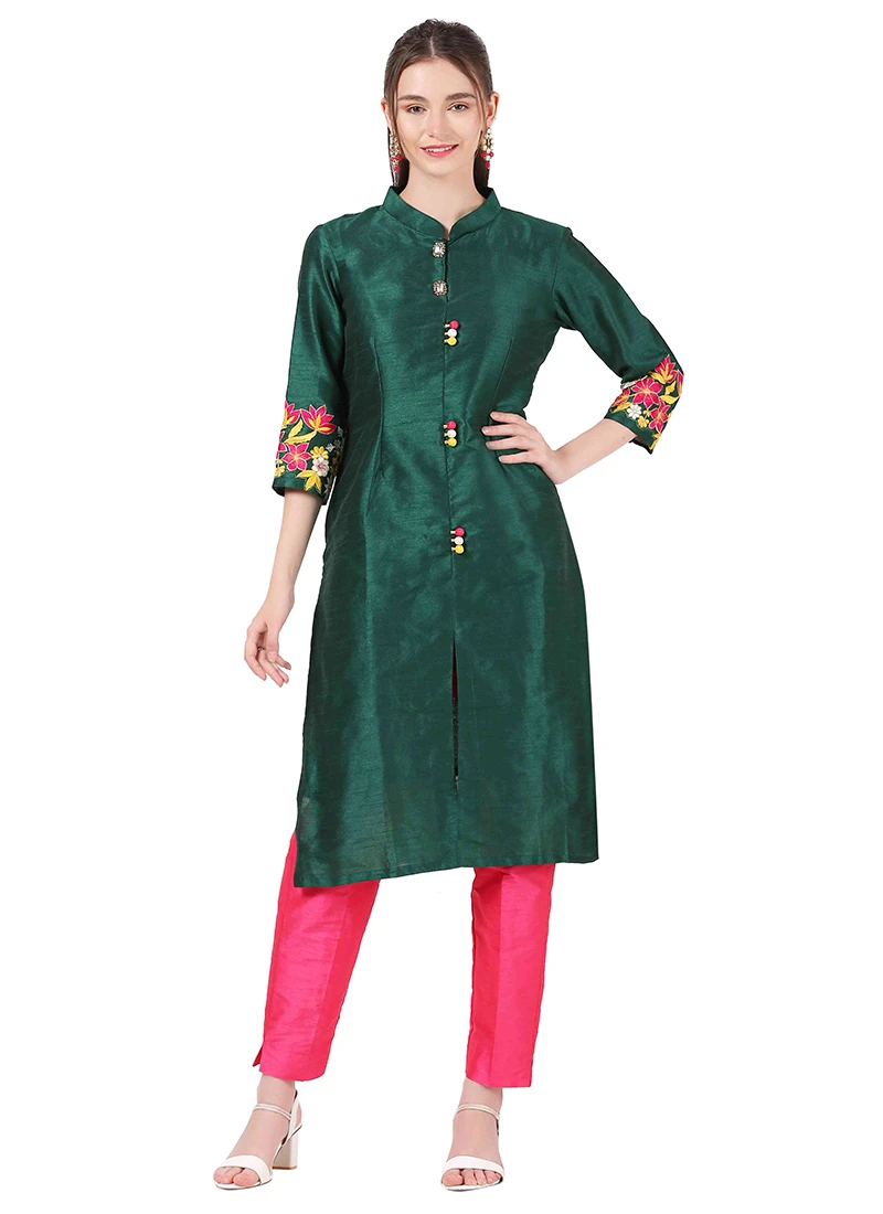 Green Raw Silk Embroidery Work Kurta Straight Pant Set Party Wear