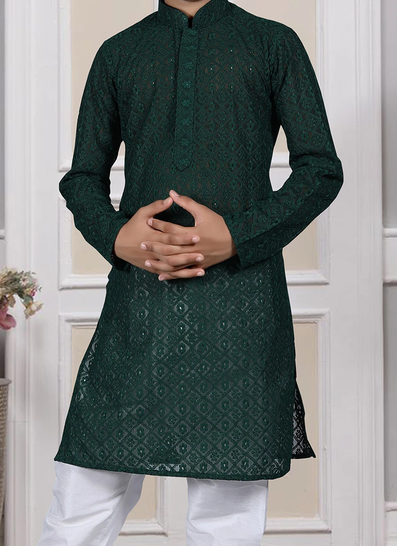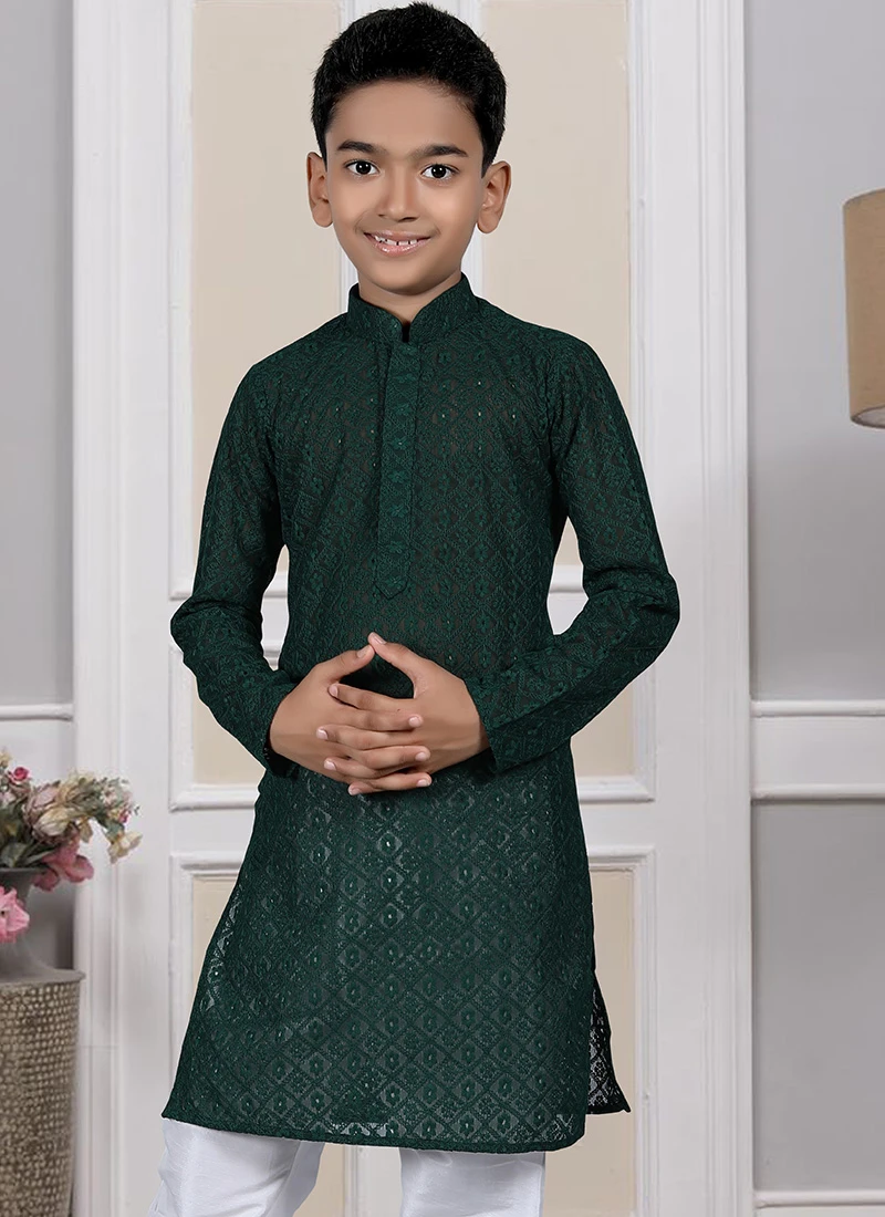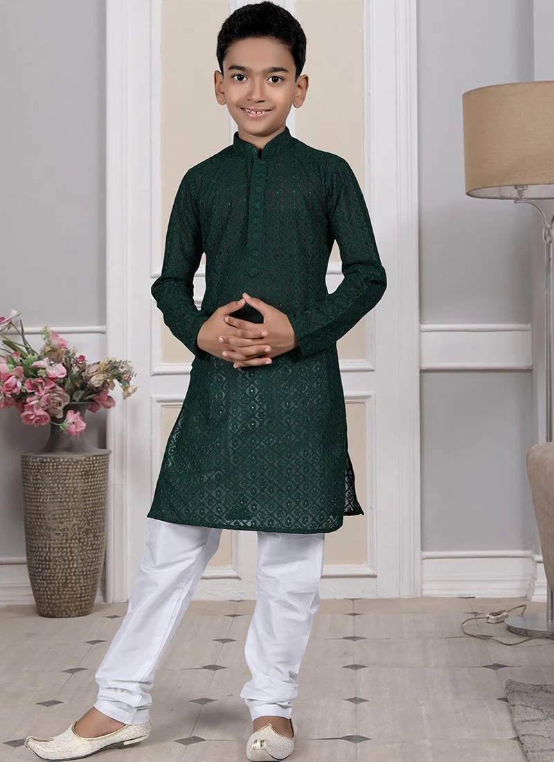 Men splendor is magnified tenfold with this green color silk kids boys kurta pyjama beautified with embroidery work over the kurta and crafted with collar neck and full sleeves looks chic and great. This kurta pyjama comes with cream color art silk chudi pant bottom.