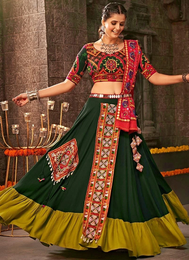 Transport yourself to a world of vibrant colors intricate craftsmanship and timeless tradition with our Green Viscose Printed Kutch Work Chaniya Choli. This exquisite ensemble is a celebration of Indian culture and artistry perfectly blending contemporary style with the rich heritage of Kutch embroidery. Whether youre gearing up for a festive occasion a traditional wedding or a cultural event our Chaniya Choli is your goto attire to make a statement and exude elegance.