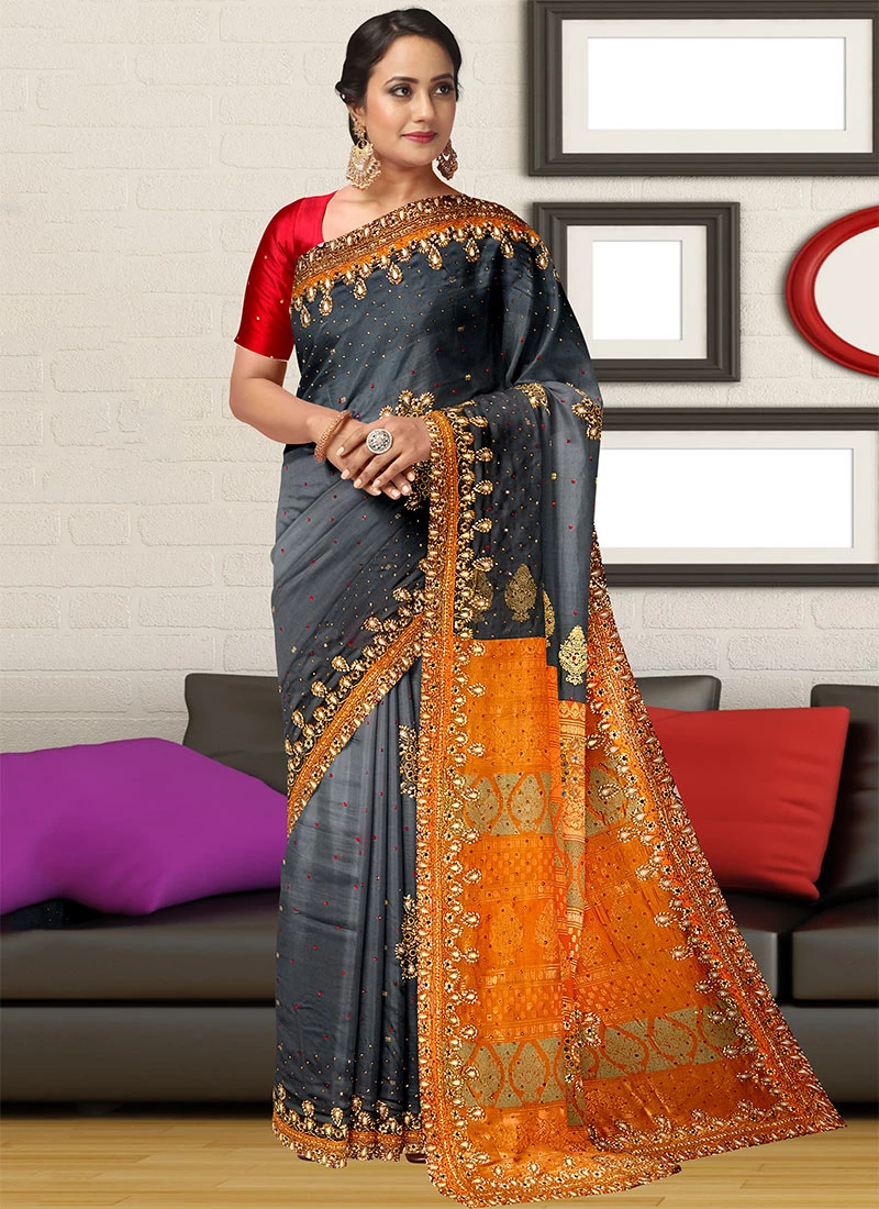 The colour palette of the saree is dominated by an elegant shade of grey which exudes sophistication and grace. Grey is a versatile colour that complements various skin tones and can be effortlessly paired with different accessories to create diverse looks. Whether its a daytime event or an evening this saree effortlessly transitions from day to night making it a versatile choice for fashion enthusiasts.