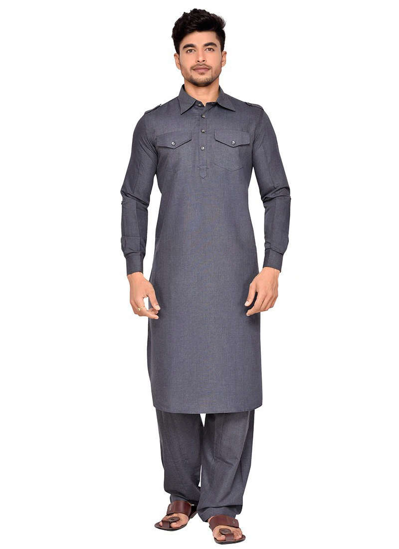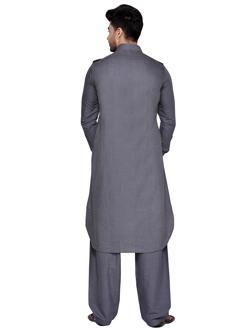 Grey art silk plain structred pathani set with side square pockets on it. Comes with matching bottom.