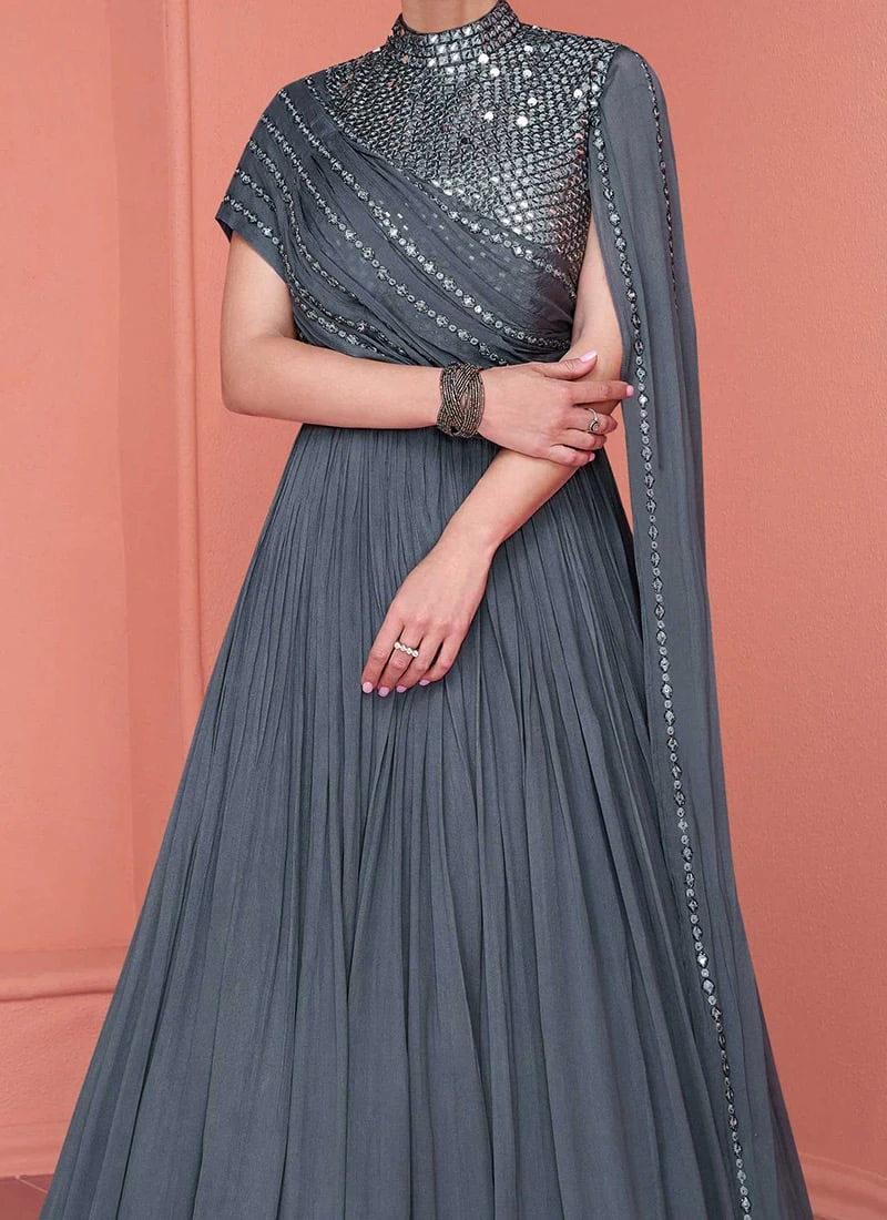 In summary grey chinon mirror work dresses and gowns are a harmonious blend of traditional craftsmanship and contemporary fashion. Their exquisite mirror work detailing combined with the luxurious grey chinon fabric creates a stunning visual impact.