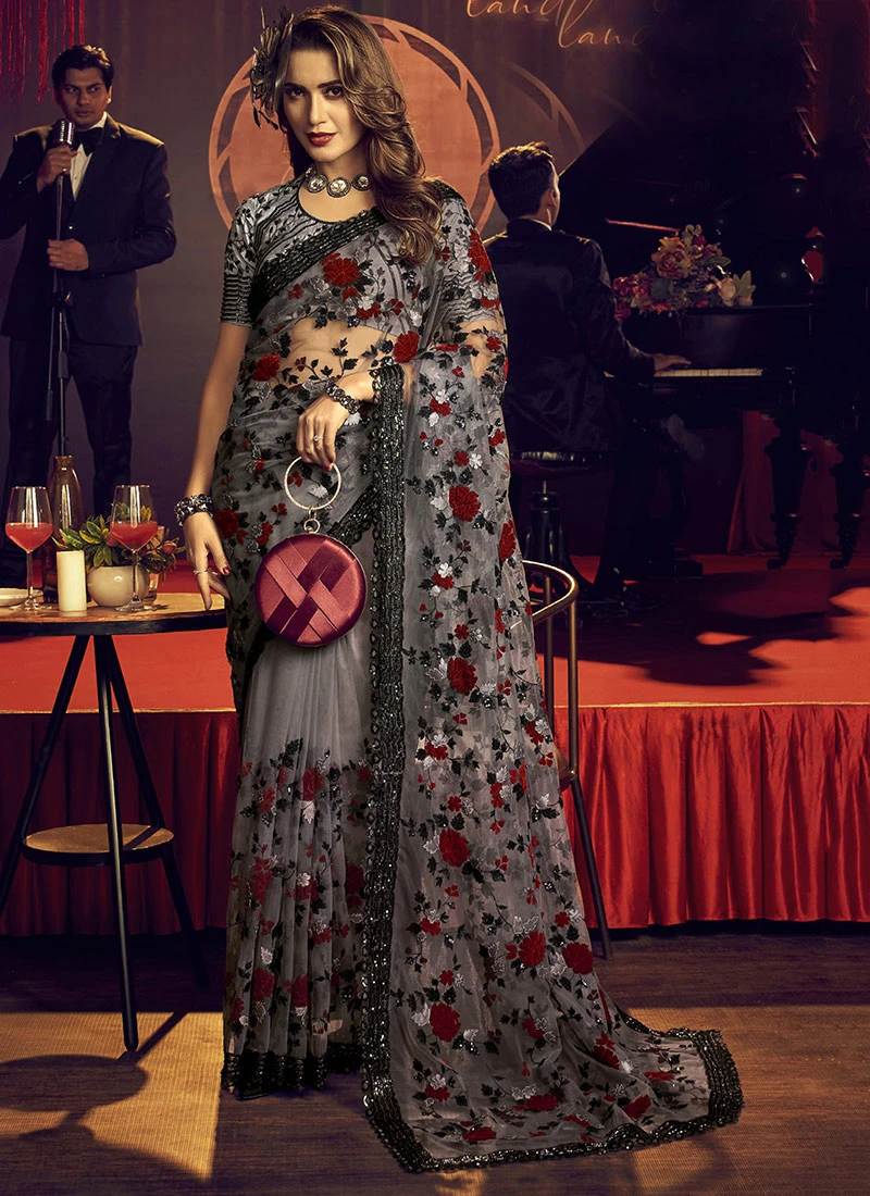 Grey Color Embroidered Moti Sequins Work Net Saree Party Wear