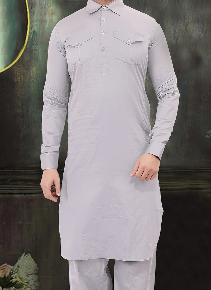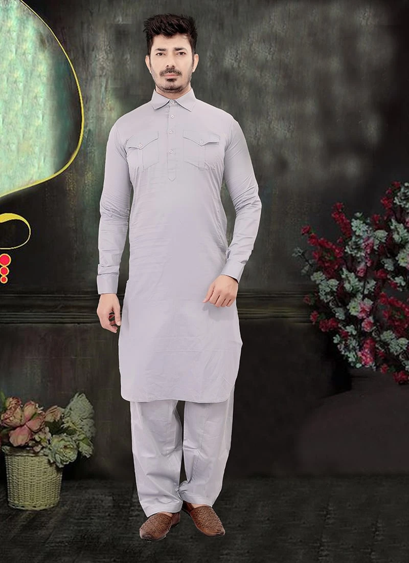 Be your own style icon in this grey cotton pathani set. This pretty attire is displaying some fantastic pattern work. This paithani set comes with grey cotton salwar pant bottom.