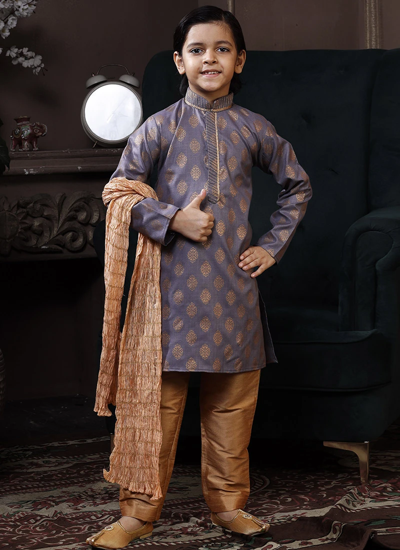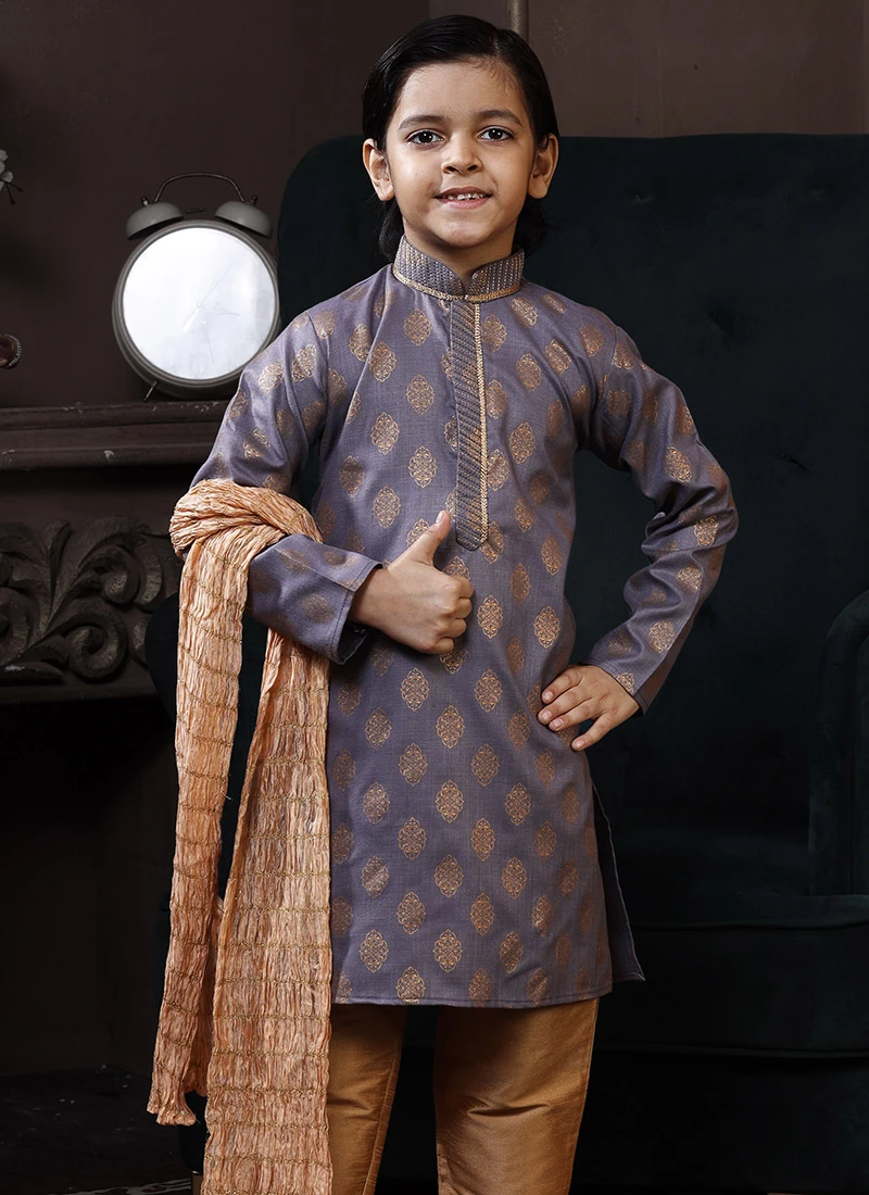Navy Blue Jacquard Silk Boys Indowestern Sherwani Party Wear