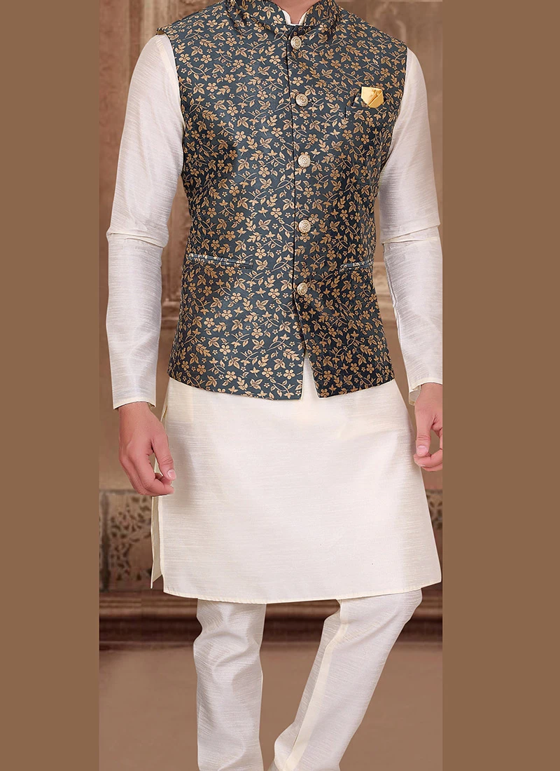 Be your own style icon in this grey silk nehru jacket crafted with mandarin collar neck and sleeveless enriched with jacquard work is representing royalty in itself.