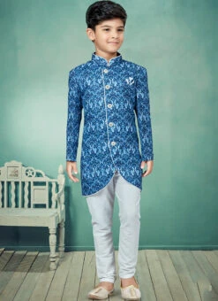 Blue Art Silk Embroidered Indowestern Sherwani For Boys Festive Wear