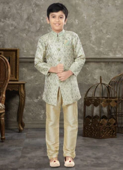 Cream And Green Art Silk Jacquard Indowestern Sherwani Party Wear