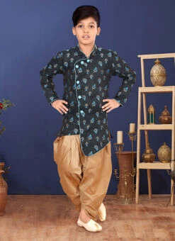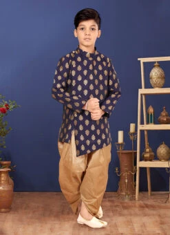 Dark Blue Jacquard Silk Boys Indowestern Sherwani Party Wear