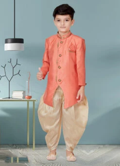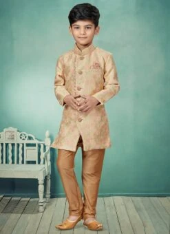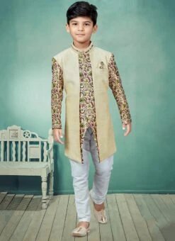 Gold Art Silk Embroidered Indowestern Sherwani For Boys Festive Wear