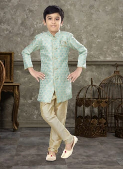 Firozi And Cream Art Silk Jacquard Indowestern Sherwani Party Wear