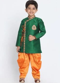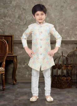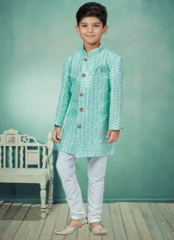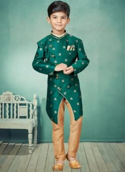 Green Banarasi Jacquard Silk Boys Indowestern Sherwani Party Wear