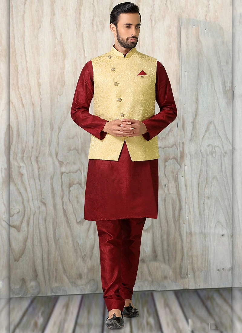 An remarkable light beige jacquard silk nehru jacket crafted with mandarin collar neck and sleeveless enriched with jacquard work is representing royalty in itself.