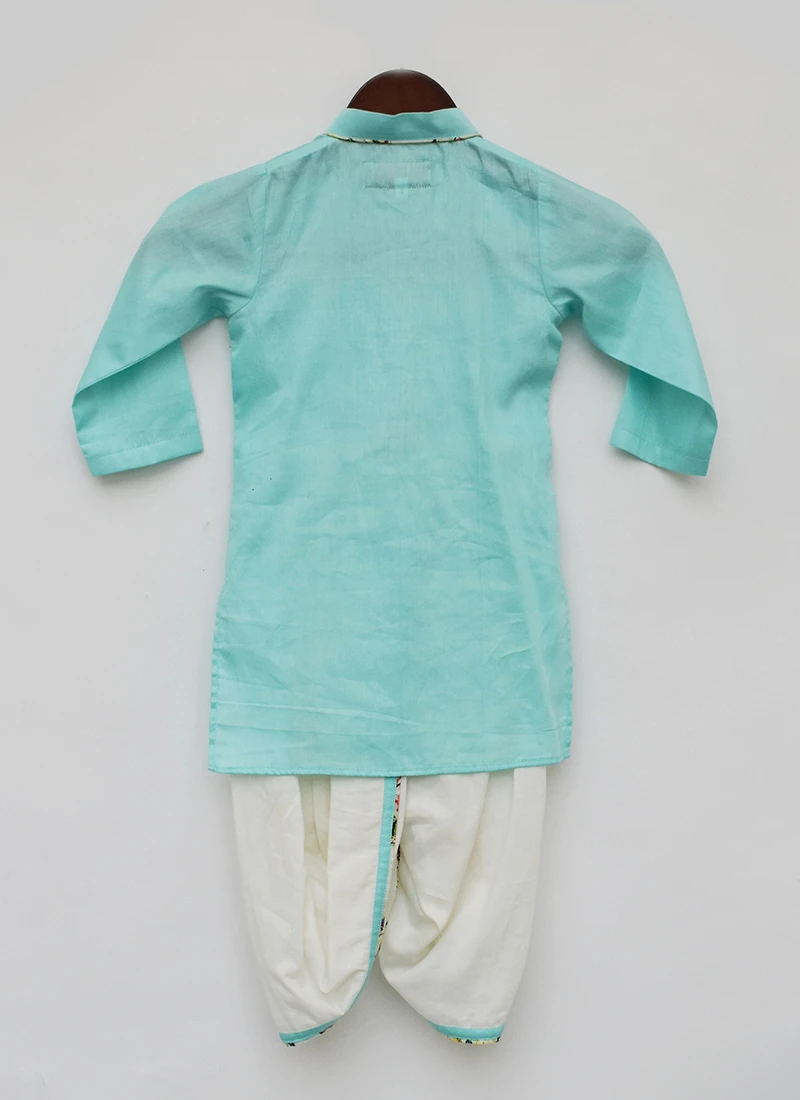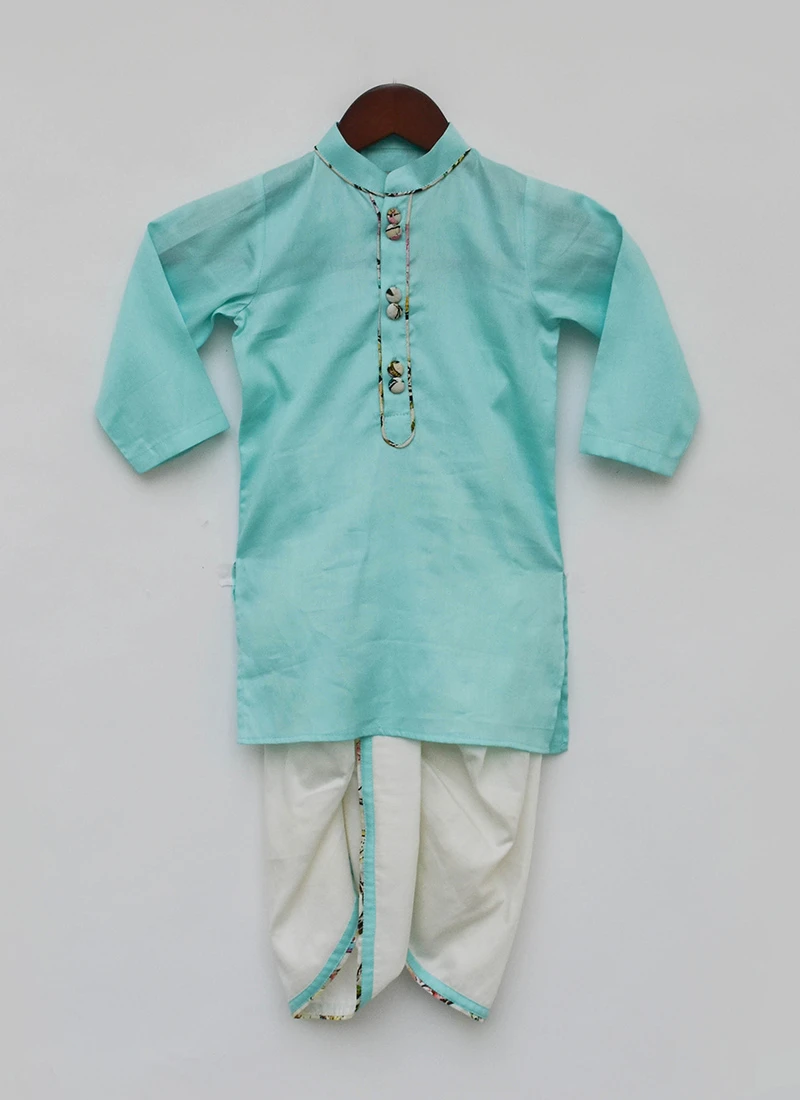 Be your very own style diva with this light blue cotton silk boys kurta pyjama. It looks chic and ideal for any affair crafted with full sleeves and collar neckstyle. This set comes with off white cotton silk dhoti bottom .