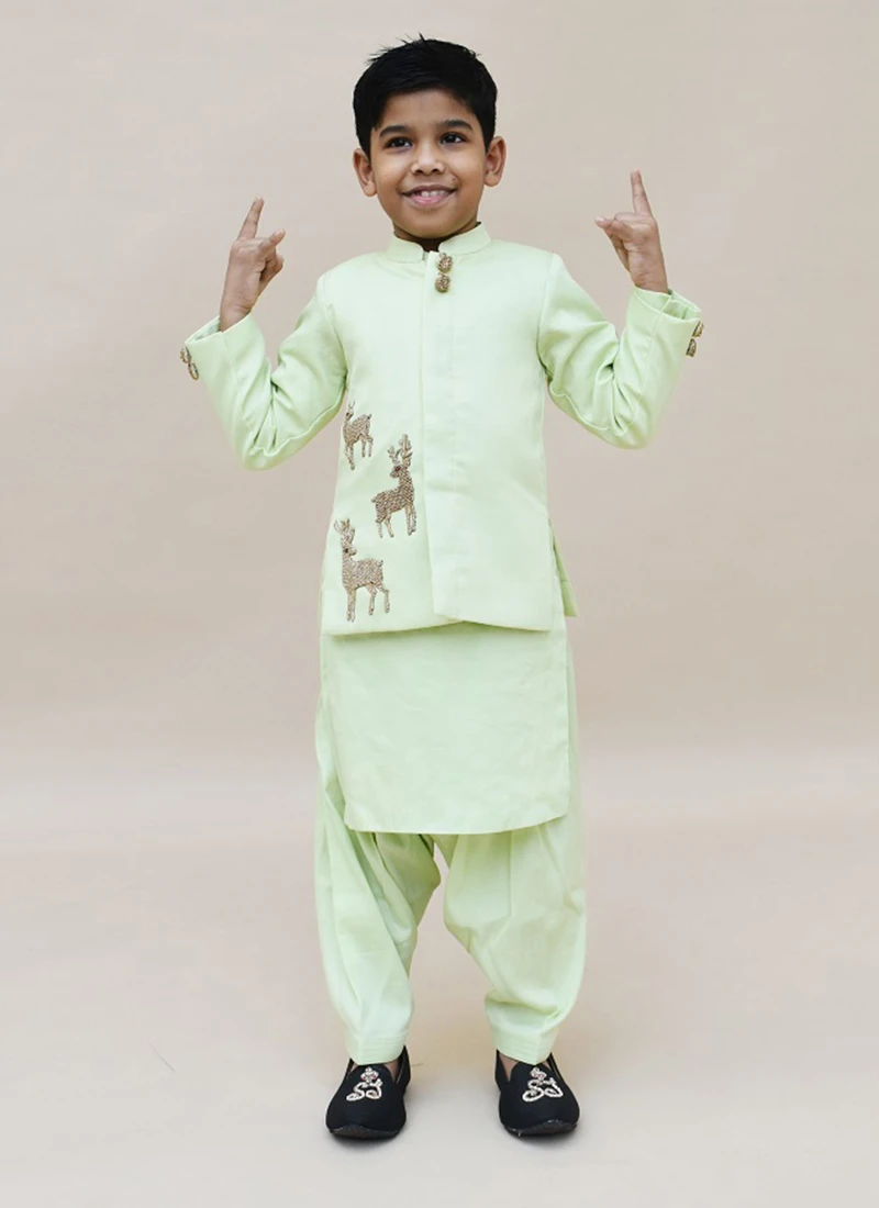 Be the first to review “Light Green Cotton Silk Embroidered Boys Bandi Set” Cancel reply