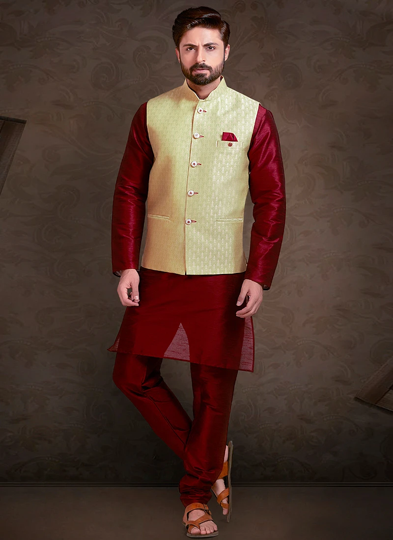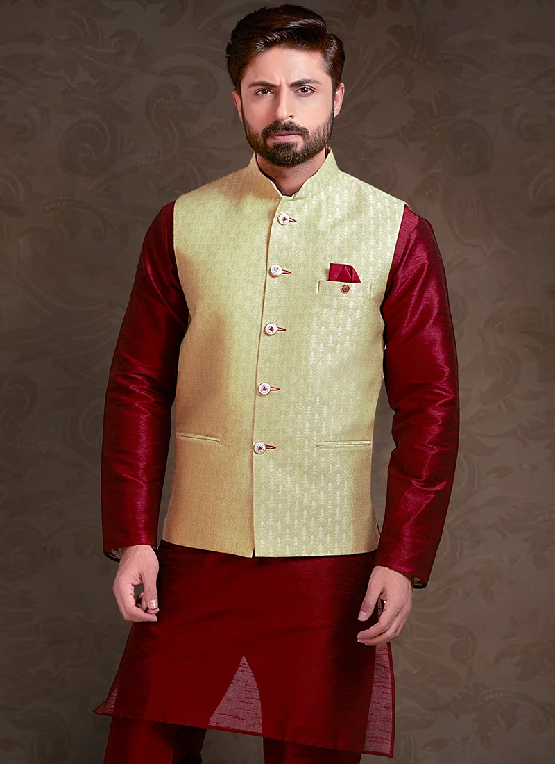 Light green art silk nehru jacket with jacquard foliage patterns all over it.