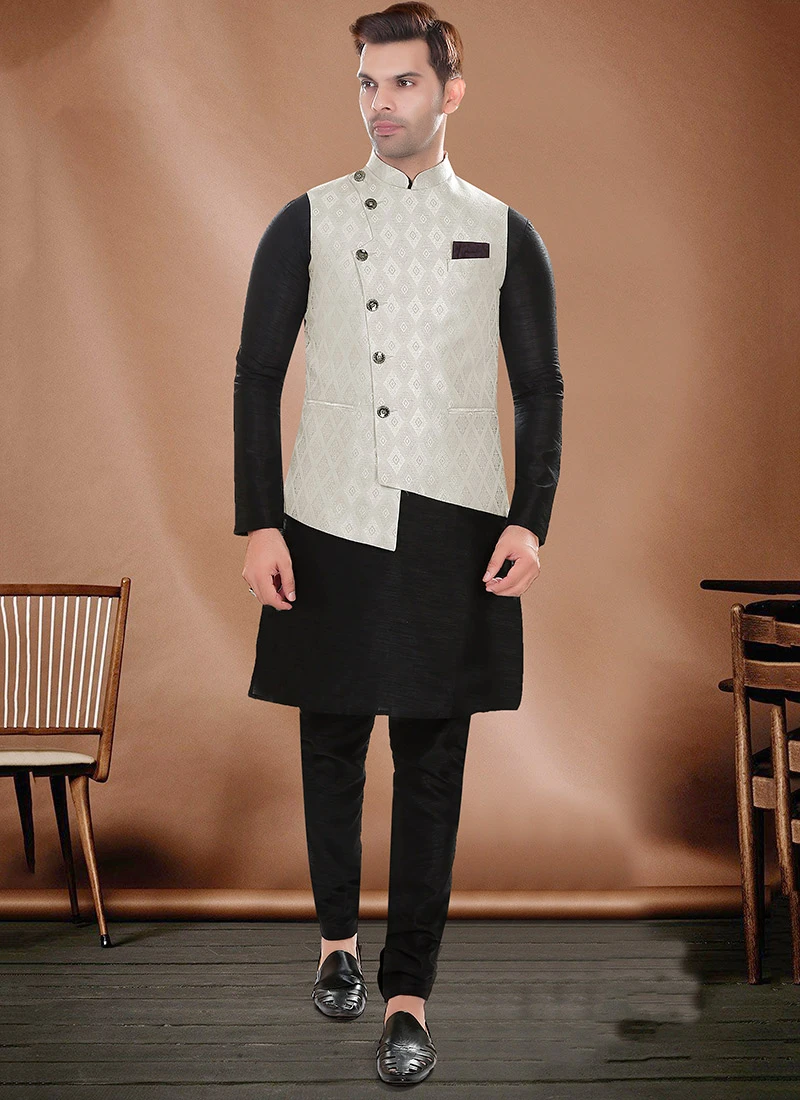 In summary the Light Grey Art Silk Jacquard Bandhgala Jacket is a timeless piece that seamlessly blends traditional Indian craftsmanship with contemporary fashion sensibilities. Its exquisite design luxurious fabric and impeccable tailoring make it a musthave addition to any discerning gentlemans wardrobe allowing you to make a lasting impression wherever you go.