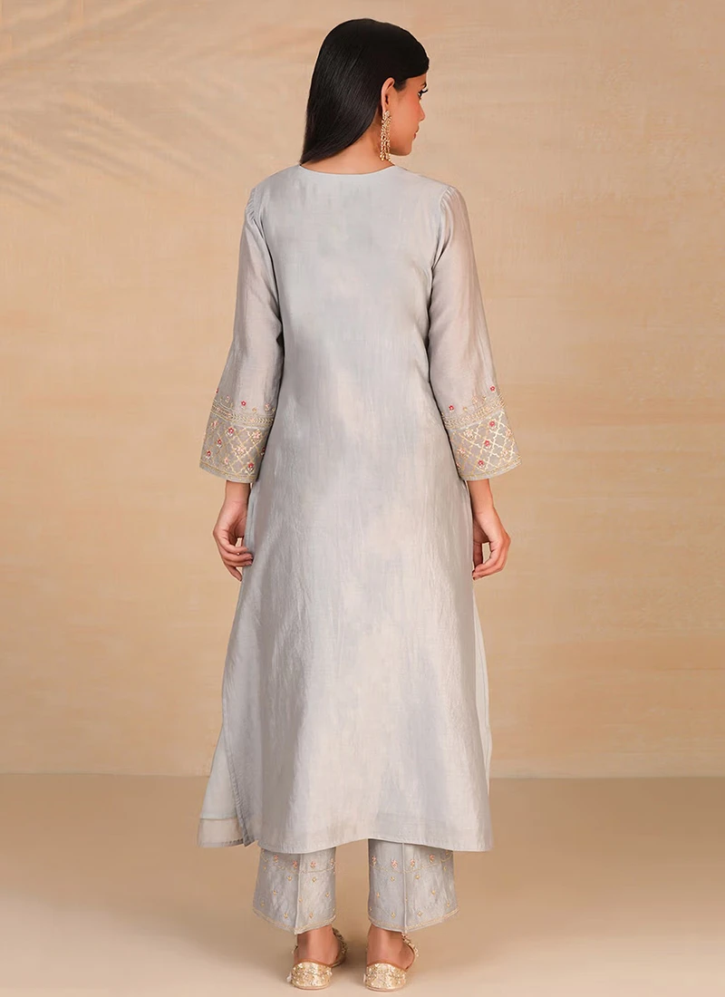 Light Grey Pure Chanderi Silk Embroidered Kurta Semi Palazzo Set Party Wear