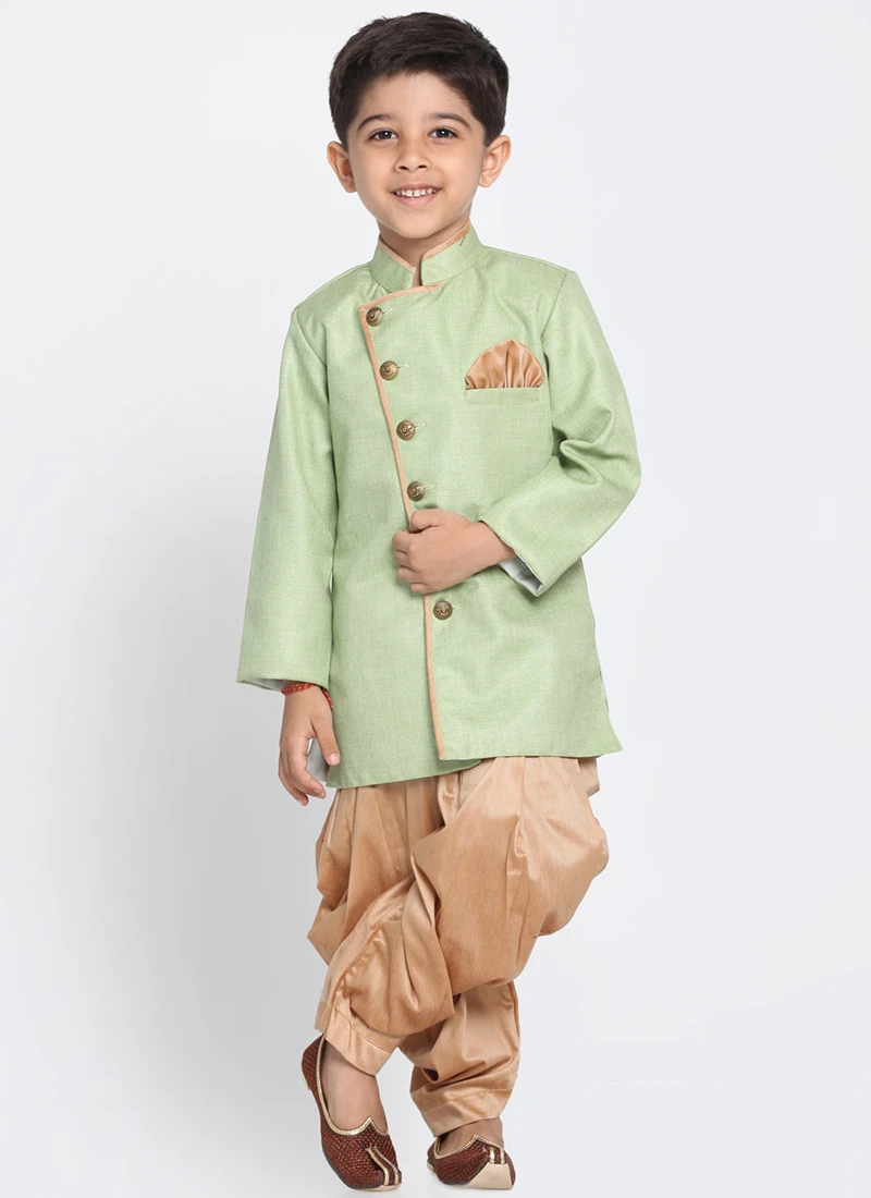 Light Pista Green art silk plain dhoti kurta set with fancy buttons on the kurta. Comes with matching dhoti buttom.