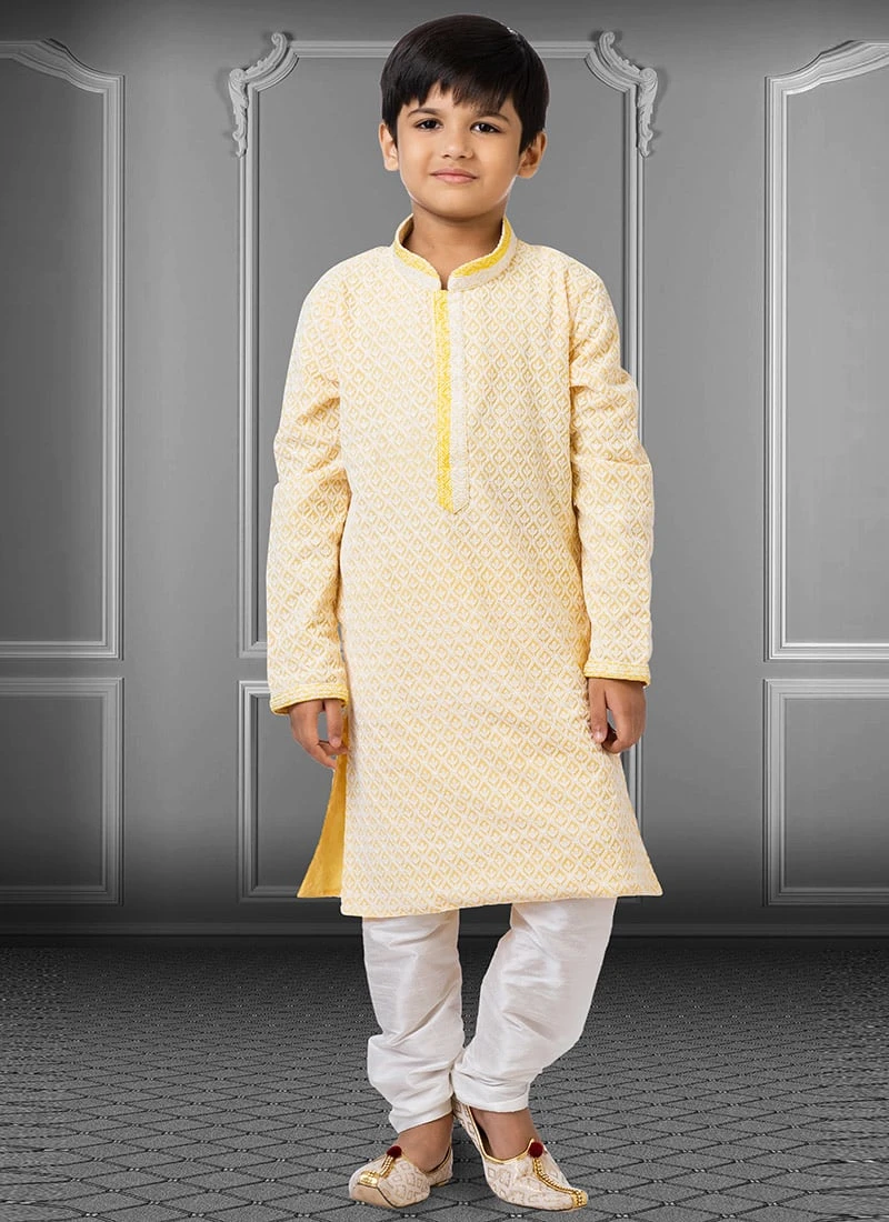 Add style towards the appearance in this light yellow georgette boys kurta pyjama enriched with thread embroidered work over the kurta crafted with full sleeves and mandarin collar neckstyle is representing a royalty in itself. This Kurta pyjama comes with white dupion silk chudi pant bottom.Fabric : Note: The Lining provided for this kurta pyjama is Cotton.Designs, colors and patterns on the actual product may slightly vary from designs shown in the image. Images are only representative.
