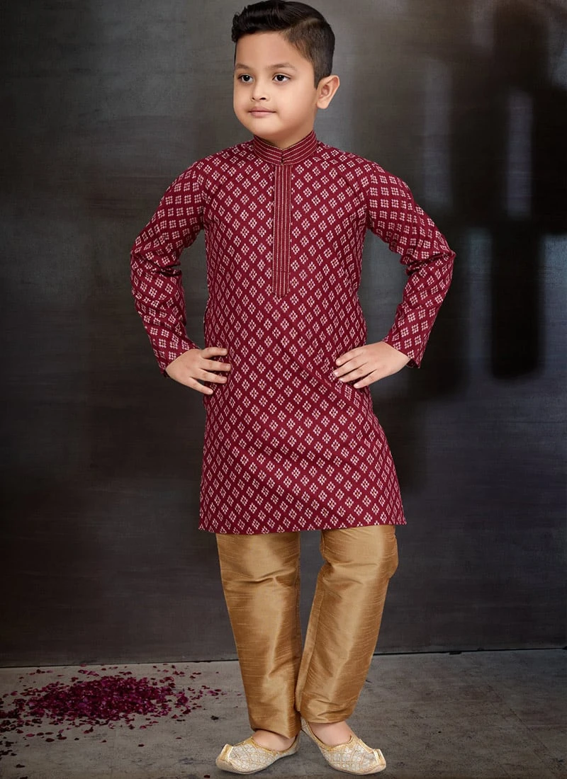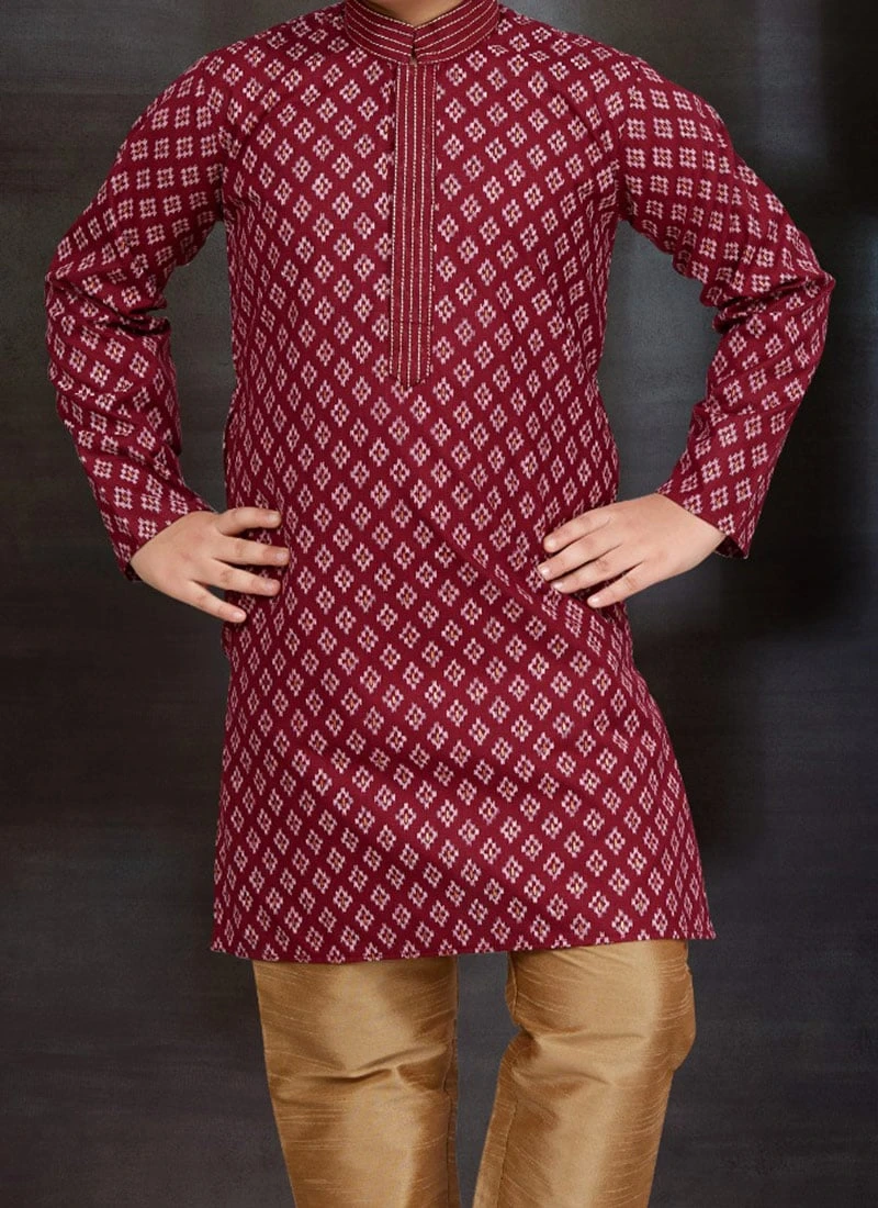 In conclusion the Maroon Blended Cotton Printed Kids Boys Kurta Pyjama is a celebration of style comfort and tradition. It is designed to make your child shine on special occasions while ensuring they remain at ease throughout the event. This outfit is a testament to the rich cultural heritage of India brought to life in a modern and stylish form. Make your childs moments memorable with this exceptional kurta pyjama ensemble. Order now and let your little one be the center of attention at any gathering.