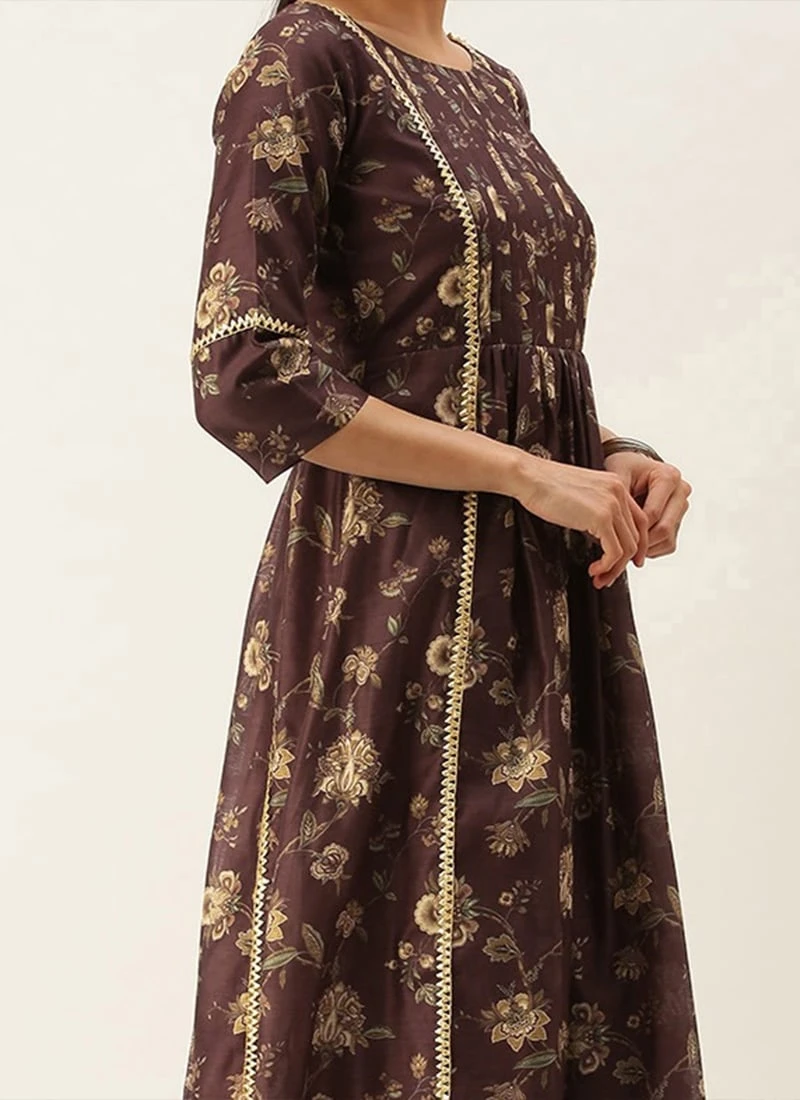 Maroon Chanderi Printed Floral Maxi Dress Festive Wear