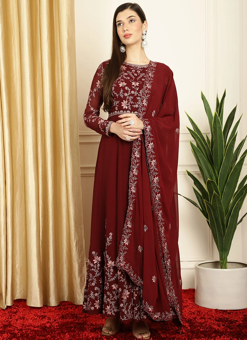 This Maroon Faux Georgette Embroidered Anarkali Suit is a timeless piece that captures the essence of traditional Indian fashion while embracing modern sensibilities. It is a statementmaking attire that is sure to turn heads at any event be it weddings receptions parties or festive celebrations. With its impeccable craftsmanship rich color and intricate embroidery this Anarkali suit is a true embodiment of grace and style making the wearer feel like a queen and leaving a lasting impression on everyone who beholds its beauty.