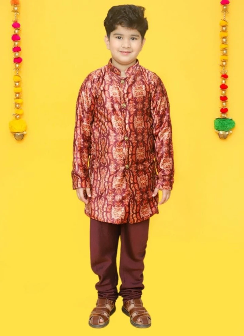 Maroon Velvet Printed Kids Boys Classic Sherwani Party Wear