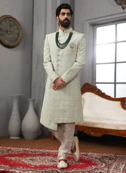 Pista Green Art Silk Lucknowi Embroidered Angrakha Sherwani Party Wear