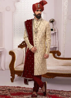Cream Jacquard Silk Brocade Embroidered Chipkan Sherwani Party Wear