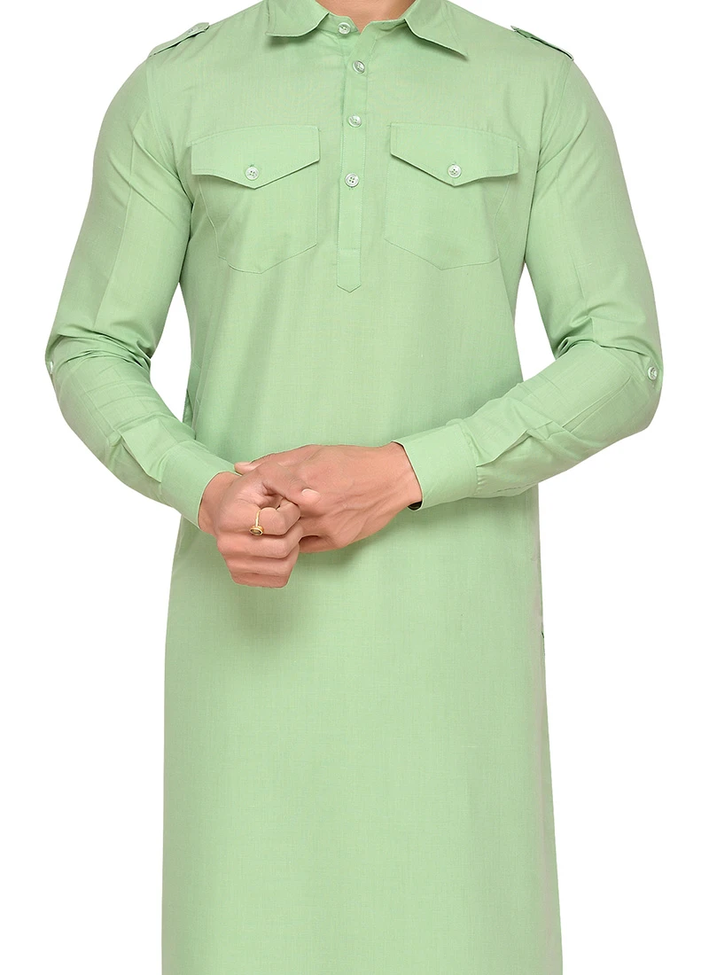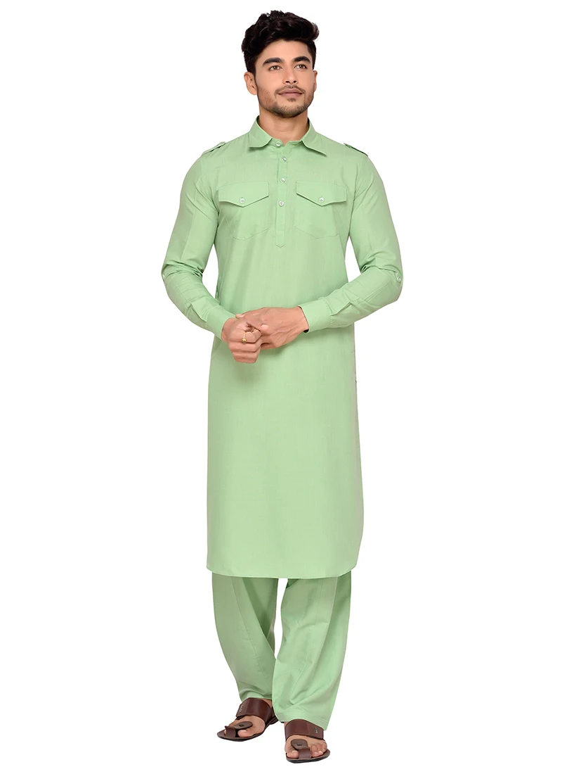 Mint green art silk plain structred pathani set with side square pockets on it. Comes with matching bottom.
