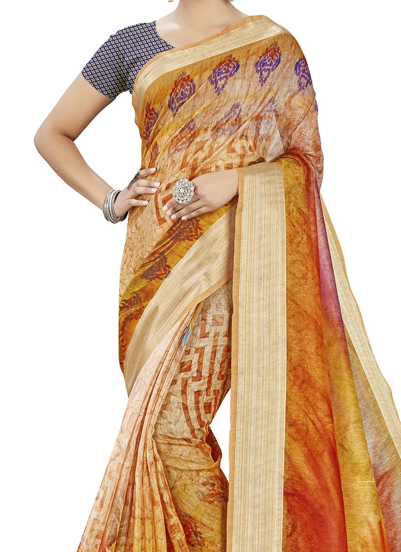 Multicolor Linen Brocade Work Saree Festive Wear