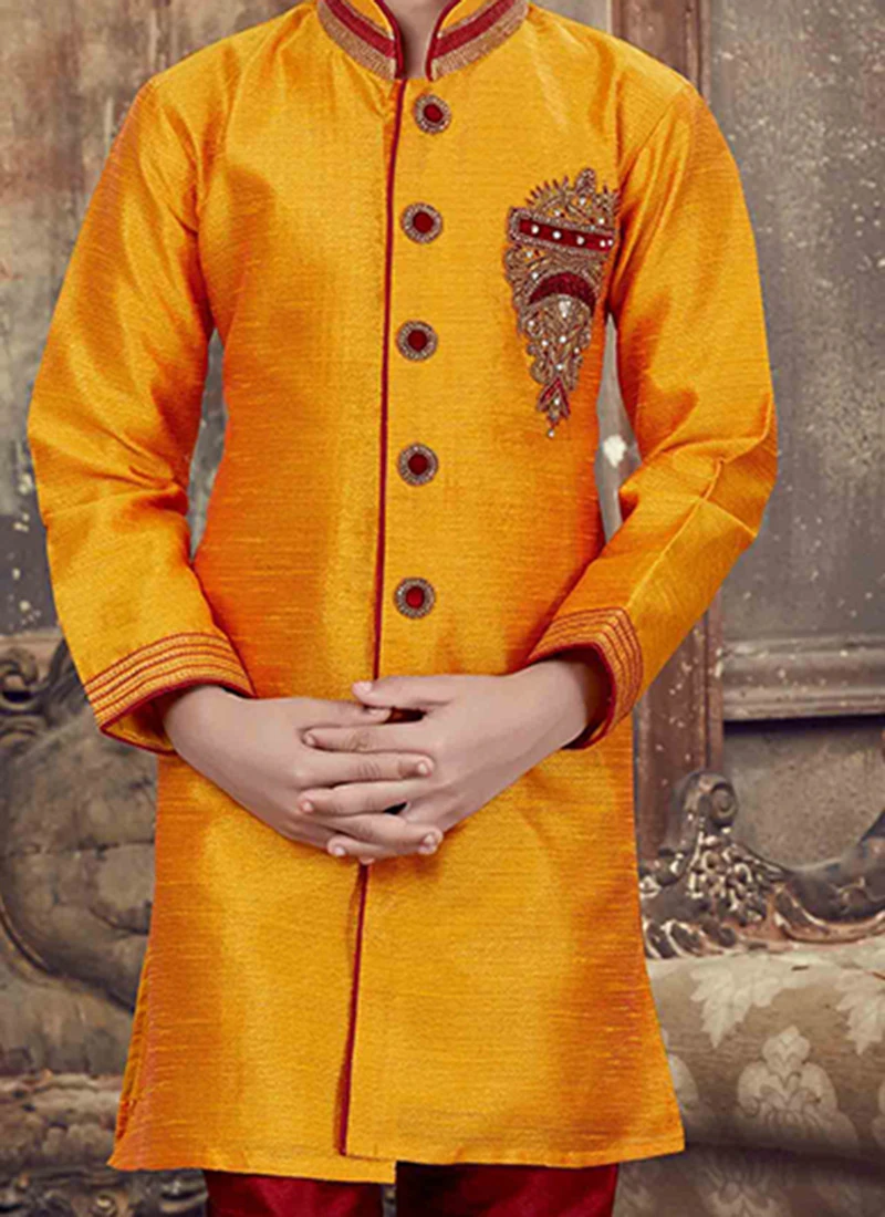 Mustard art silk kids kurta pyjama set with stone works enhancing the embroidered foliage motif on the yoke. Comes with matching maroon bottom.