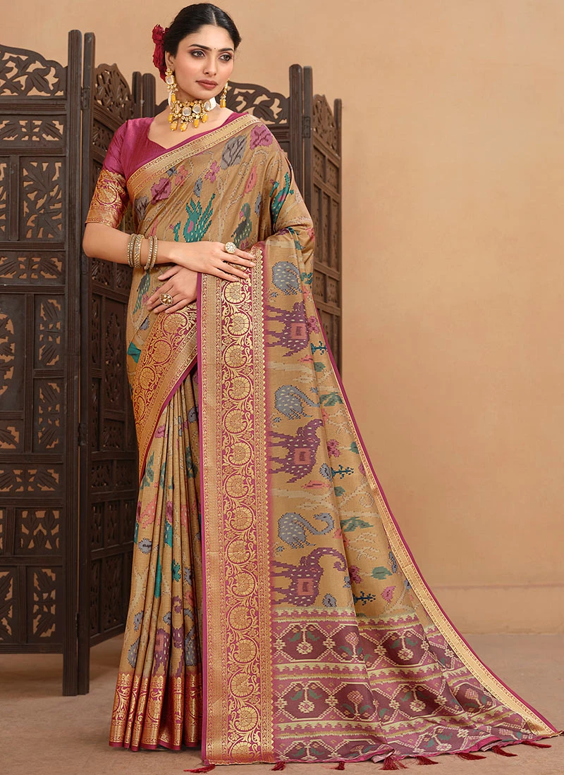 The intricate digital print on the saree is a testament to the marriage of tradition and technology. The digital printing technique allows for precise detailing and vibrant colours creating a mesmerizing visual appeal. The artistic motifs and patterns on the saree showcase a seamless fusion of traditional Indian design elements and modern aesthetics making it a versatile choice for both traditional ceremonies and modern celebrations.
