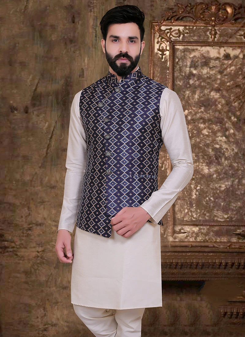 Be your very own style diva with this navy blue art silk nehru jacket crafted with mandarin collar neck and sleeveless enriched with digital printed work is representing royalty in itself.