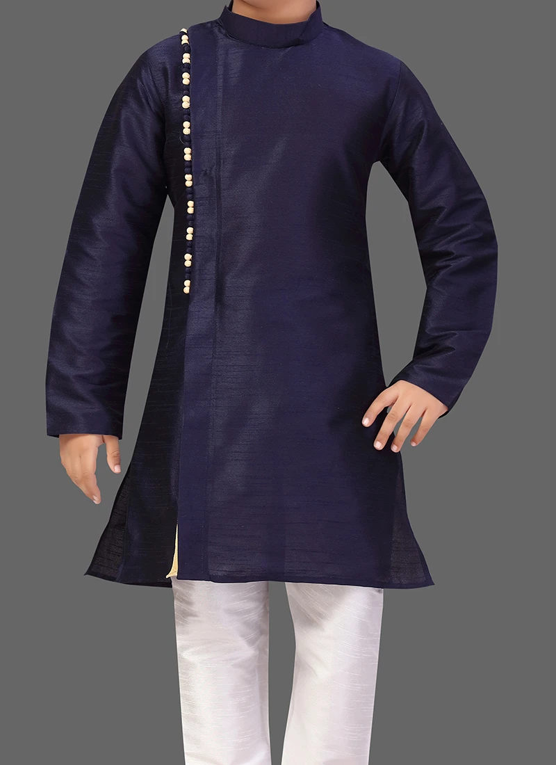 You are sure to make a powerful style statement with this navy blue art silk kurta pyjama crafted with mandarin collar neck and full sleeves enriched with soild stitched work and potli design is representing a royalty in itself. This kurta pyjama comes with white art silk pant bottom. th white art silk pant bottom.