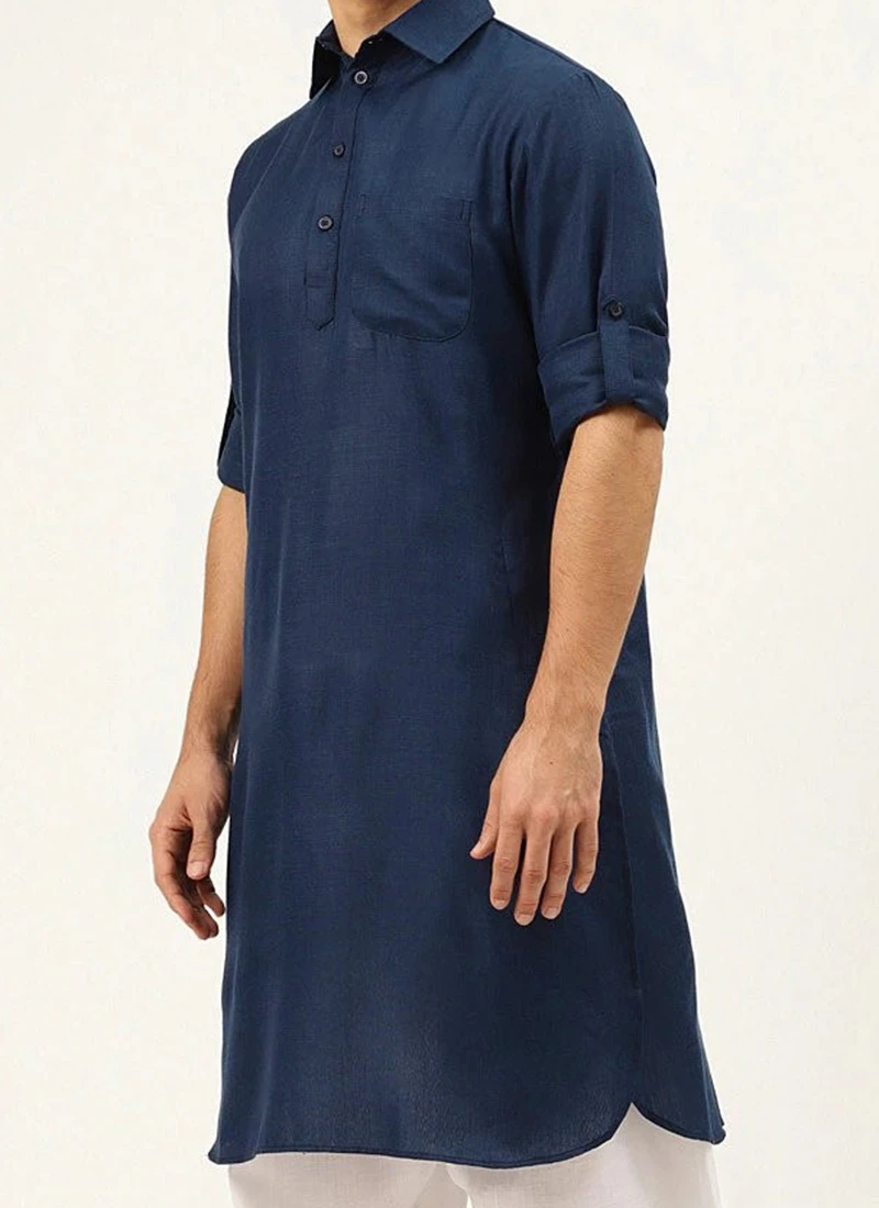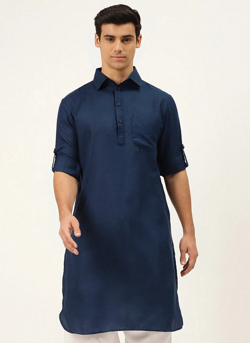 Be your own style icon with nay blue cotton blend kurta. The ethnic soild plain work crafted with collar neck with button open yoke and full sleeves adds a sign of splendor statement for the look.