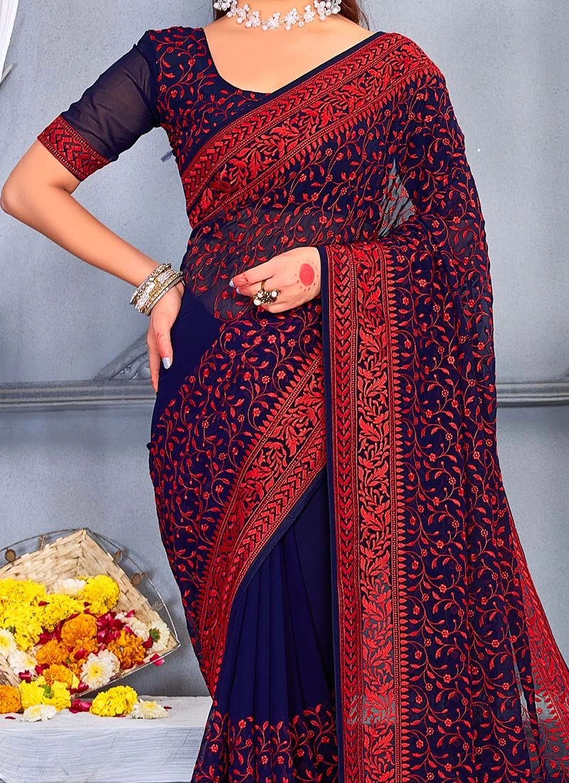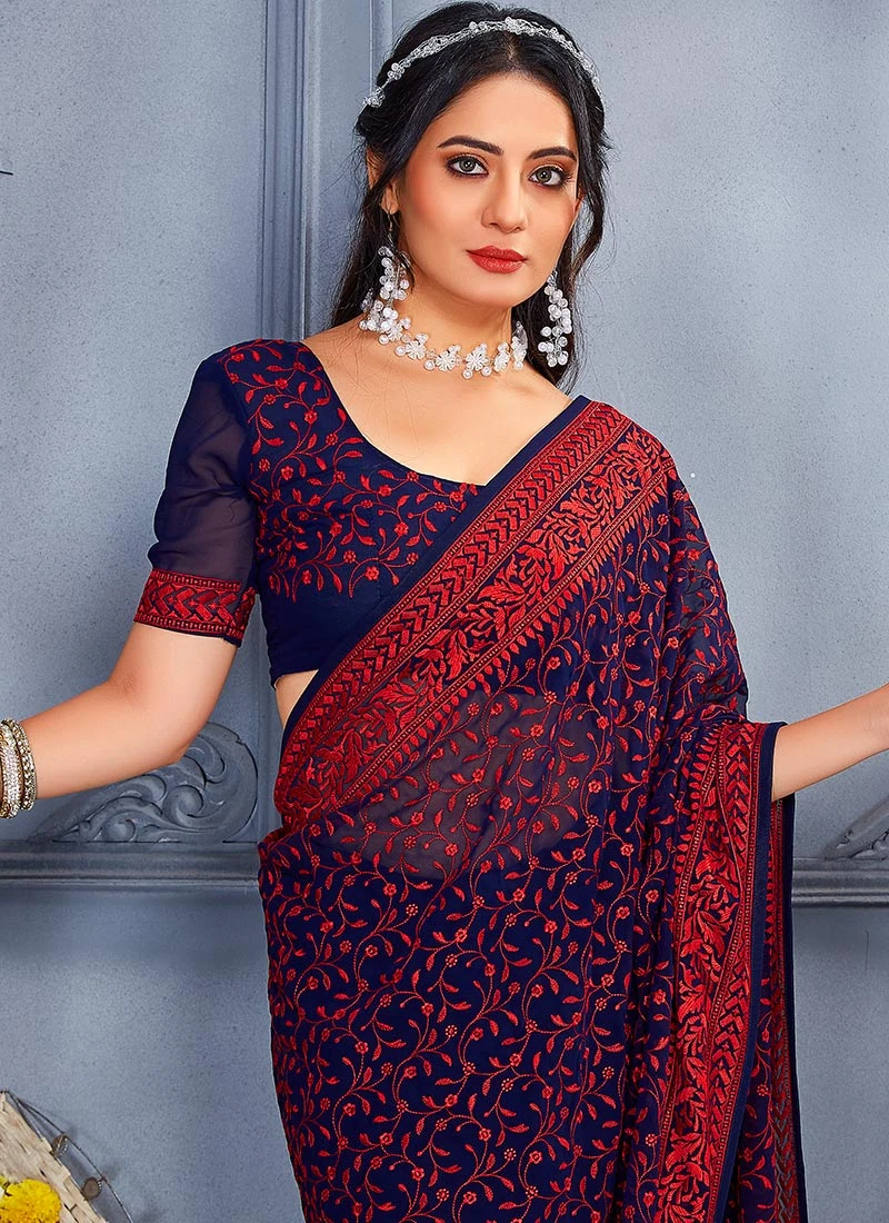 Navy Blue Georgette Embroidery Work Saree Party Wear