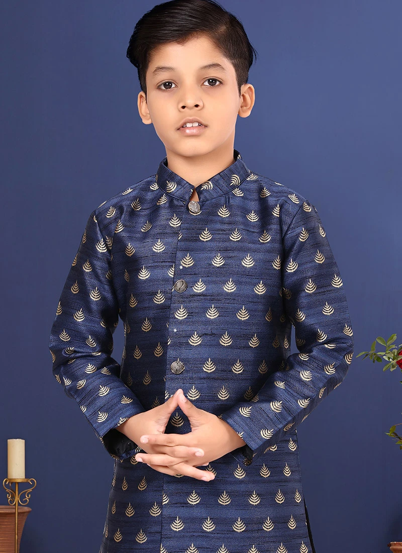 Navy Blue Jacquard Silk Boys Classic Sherwani Party Wear